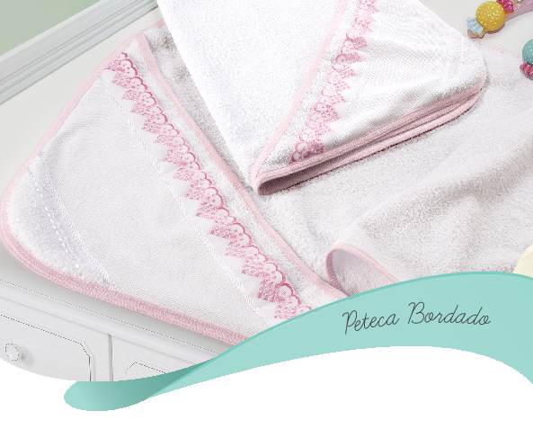 São babadores, fraldas de boca, tecido fralda em metro, toalhas com capuz de fralda e de felpa. A cor predominante sempre é o branco, com detalhes em azul ou rosa, e existem peças todas em branco também. Todas as peças tem um espaço que possibilita que nós, mamães e pessoas criativas, personalizem as peças para os bebês.